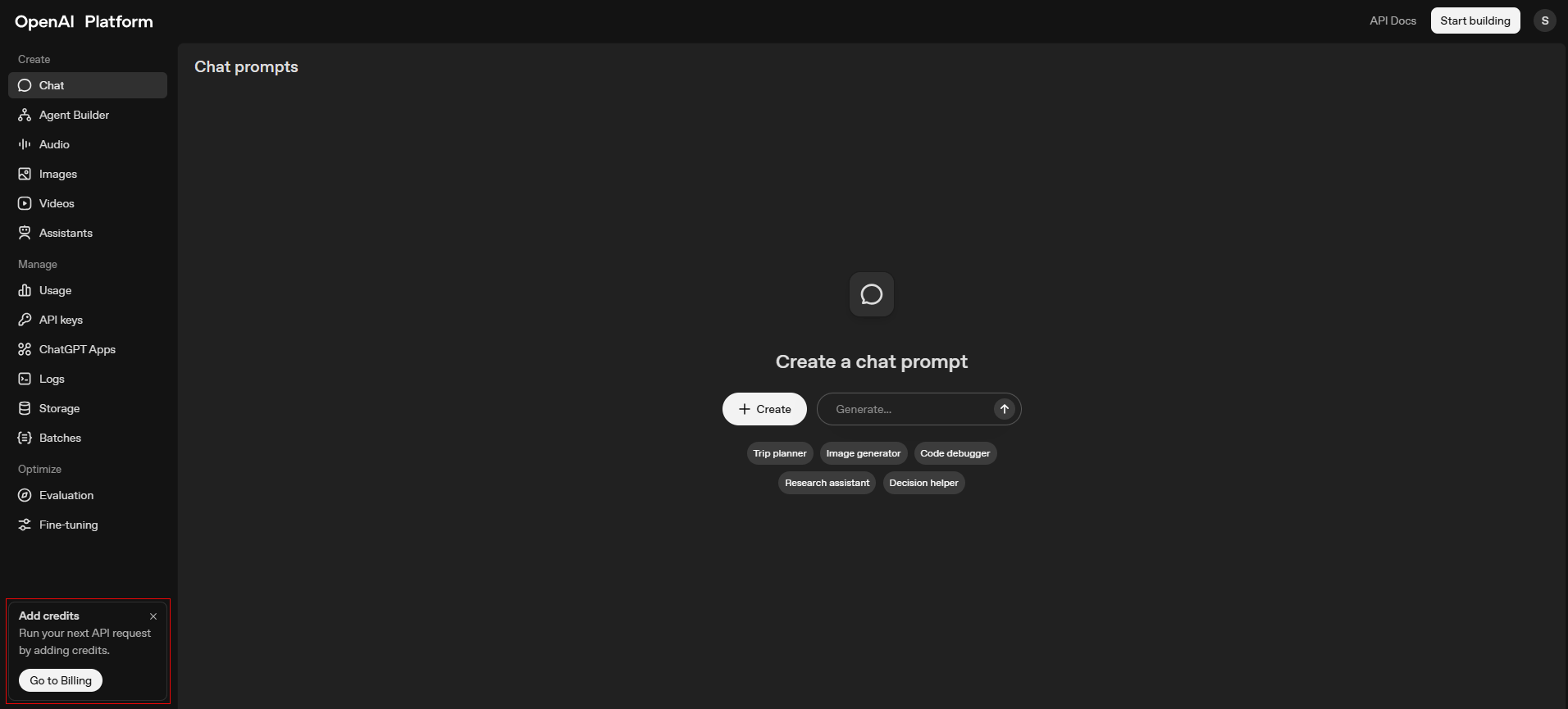 Log in at platform.openai.com Note: if you have an account with ChatGPT then you can use those login details. However, a ChatGPT Plus subscription does not cover API costs, as they are billed separately.