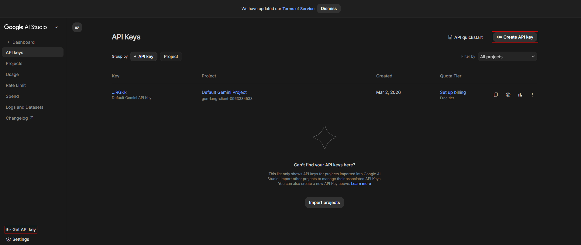 On the left-hand sidebar, click “Get API key”, then click “Create API key”: