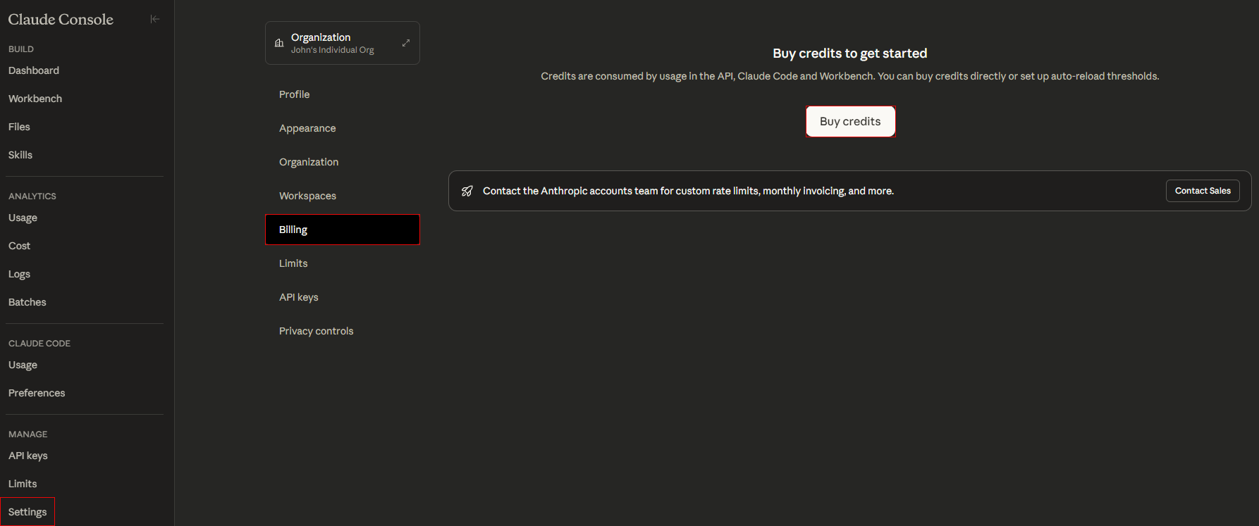 Log in, go to the Settings tab on the left side bar, click Billing and then click Buy Credits: